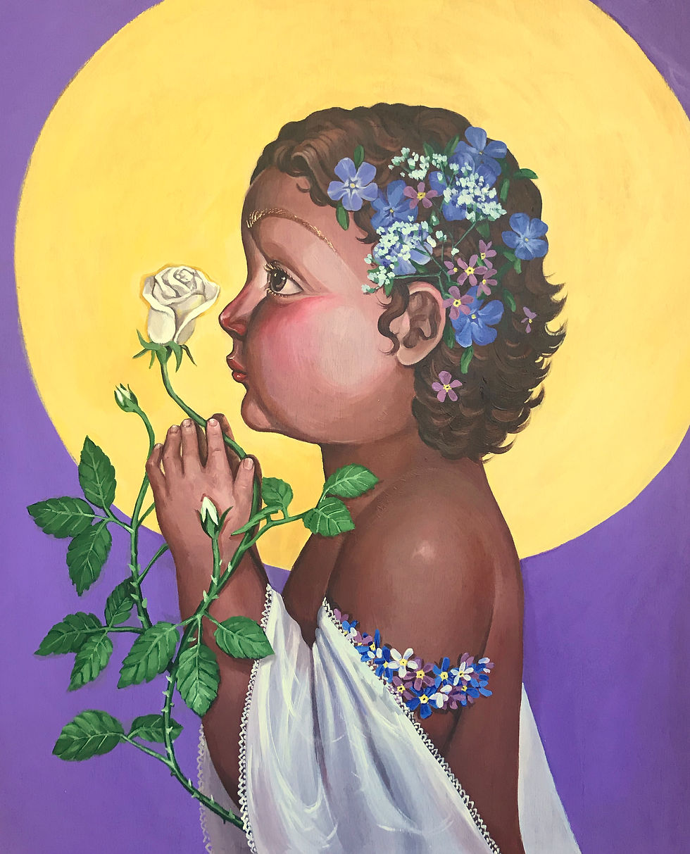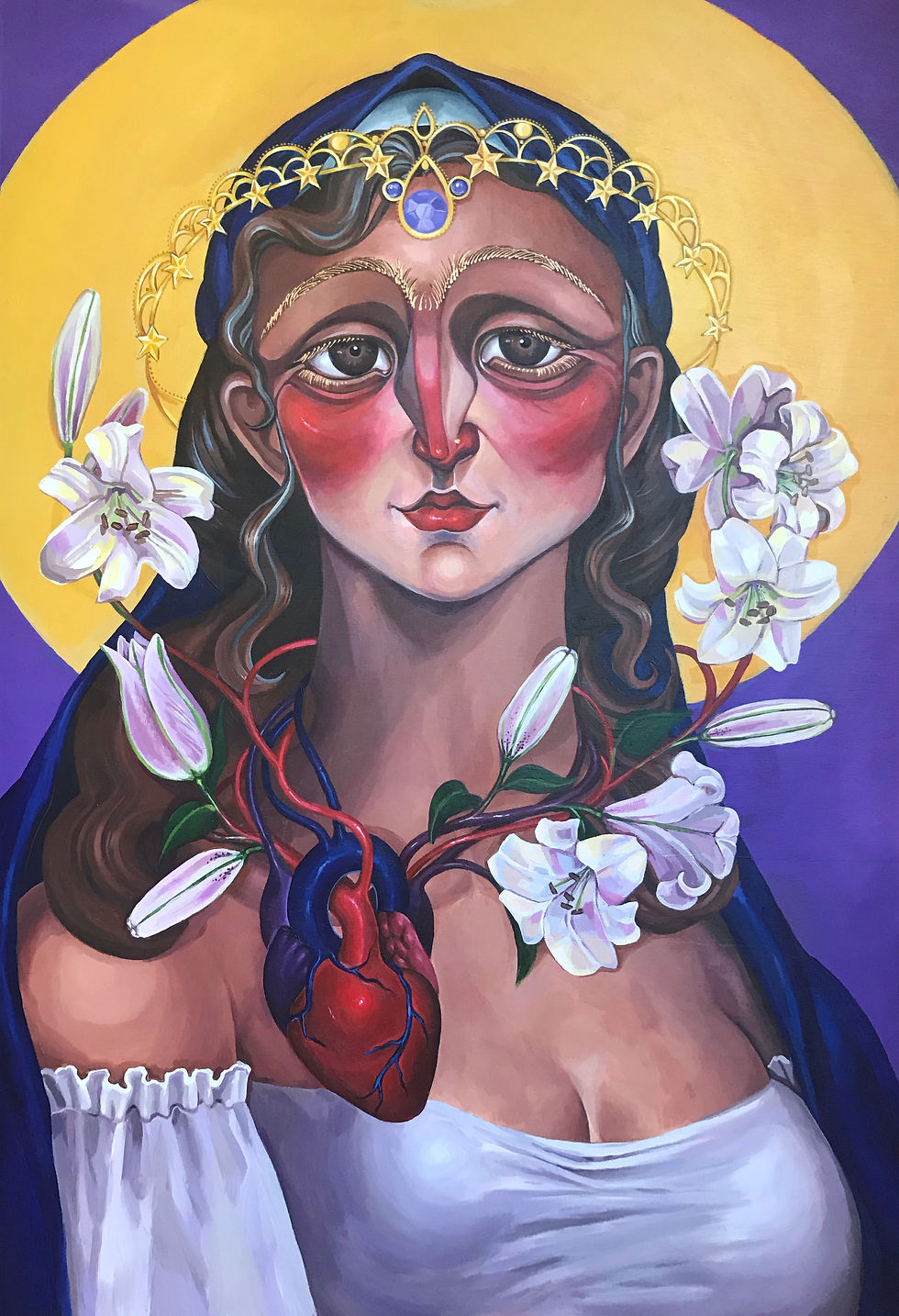 This is the debut solo exhibition for Nik Keter. Following the Covid quarantine Nik began a devotional practice and was naturally drawn to the same goddesses and Mary that she had been devoted to as a child, which allowed her to set her fears aside and produce this exhibition: in honour of Her, and as a message to others to embrace Her in their lives, both in prayer (regardless of one’s faith) as well as in our daily lives and actions towards people. We are all called to be Mothers; as to be a mother is to give unconditionally – like the Earth below our feet and Mary to Christ.