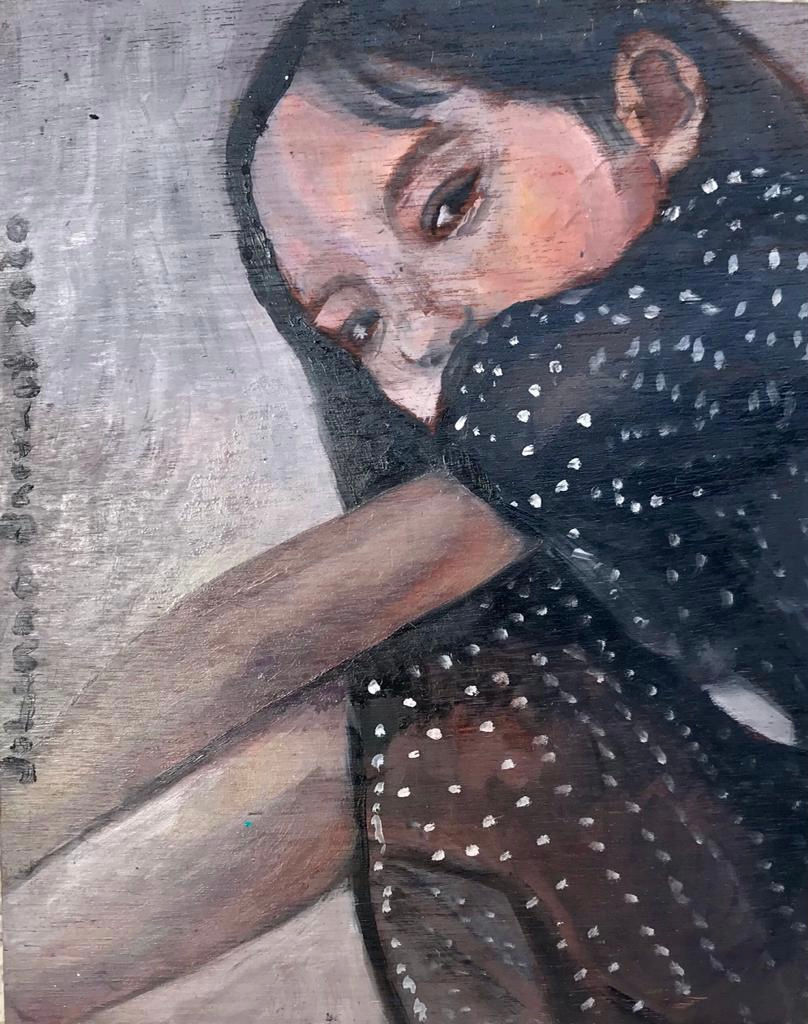All the works in this exhibition are depicting female portraits, all staring directly at the viewer. Their stare is a powerful one that conquers the viewer’s own space and takes over. The use of props and backgrounds is a very minimal one and lacking detail, thus enhancing the dominance of the portrayed face and the crudeness of the truest self when one is alone without any distractions.